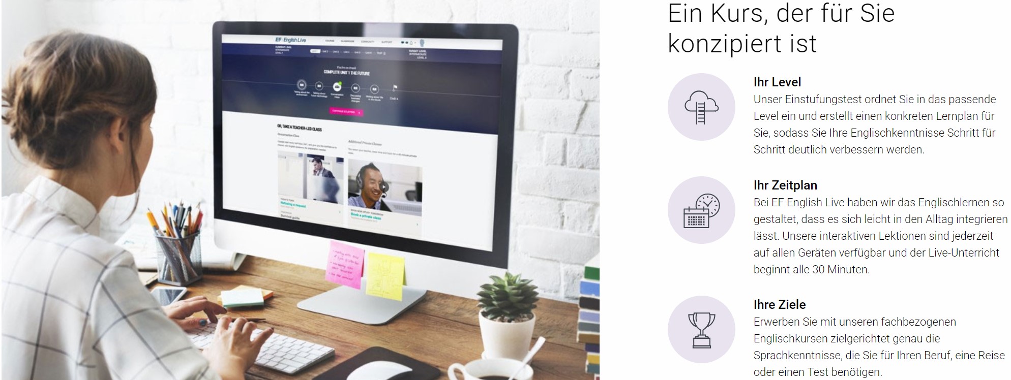 Bei EF English Live können Anfänger und Fortgeschrittene von zu Hause oder unterwegs zwar „nur“ Englisch lernen. Doch dafür so intensiv und effektiv wie bei fast keinem anderen Online-Sprachkurs. Der modulare Aufbau überzeugt mit einer innovativen Kombination aus Live-Unterricht und interaktiver Lernplattform. Beides funktioniert direkt im Browser oder mittels Android- und iOS-App. Auf EF English Live finden alle 30 bis 60 Minuten Live-Gruppenstunden mit anderen Schülern und Lehrern statt und die Schüler können zu jederzeit Privatunterricht buchen. Lernende haben Zugriff auf eine riesige Auswahl an Lernmaterialien, Übungen und individuellen Kursen.